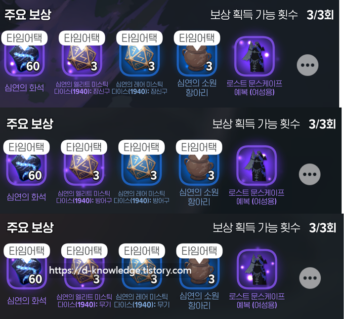 💡 핵심은 패턴 숙지와 효율적인 파티 구성이며, 타임어택 보상을 노리는 유저라면 기존과 같이 진행 하시면 될 것 같습니다.