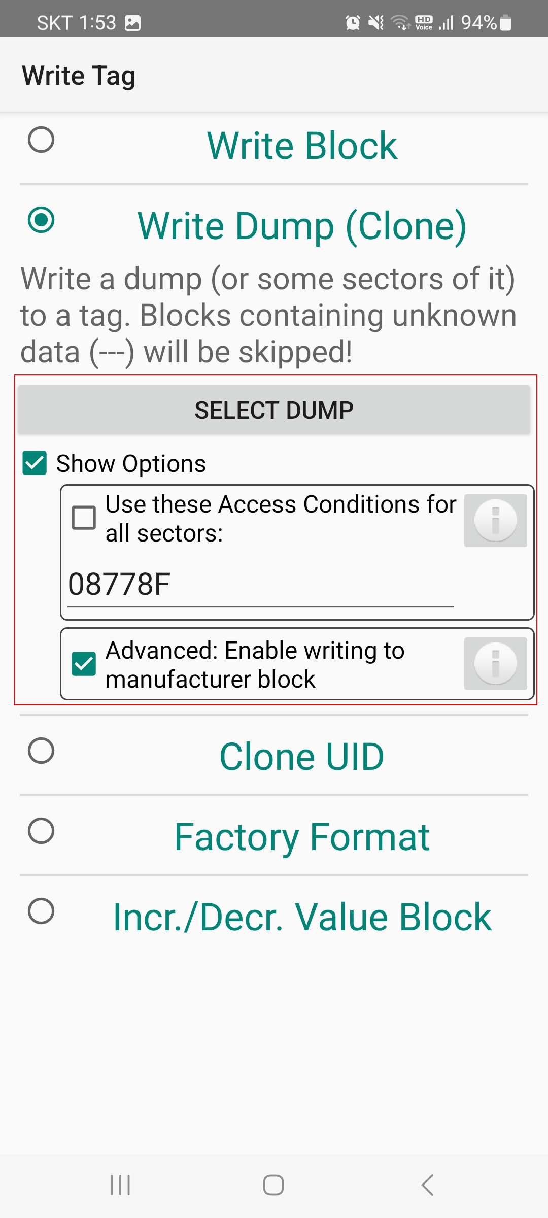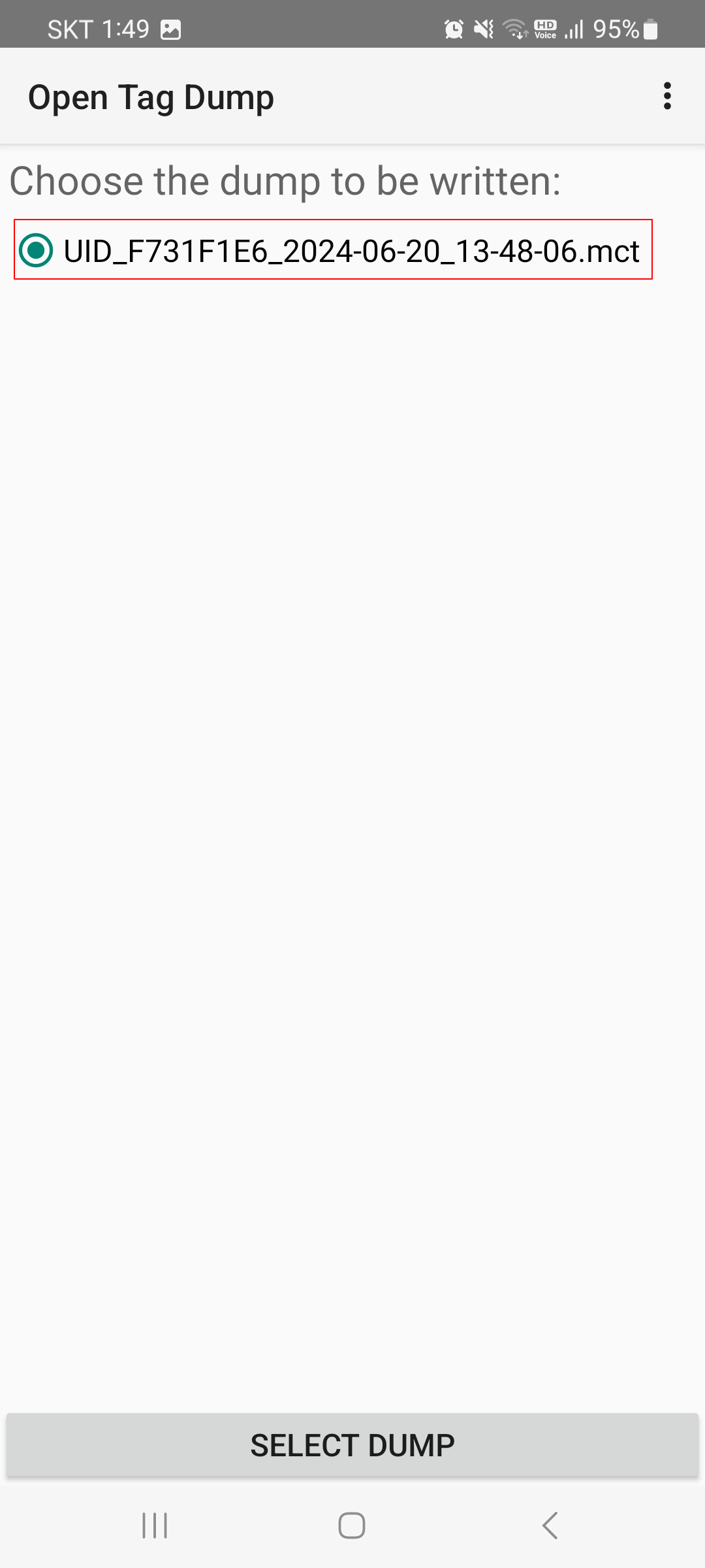 - READ TAG에서 저장한 파일을 선택하고 SELECT DUMP를 클릭하자.