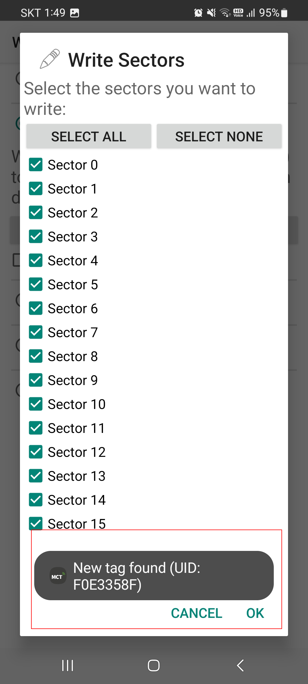 - 접촉이 되어 New tag found라는 알림이 표시되면 OK를 클릭하자. (완료 전까지 계속 핸드폰에 RFID 태그 스티커를 접촉)