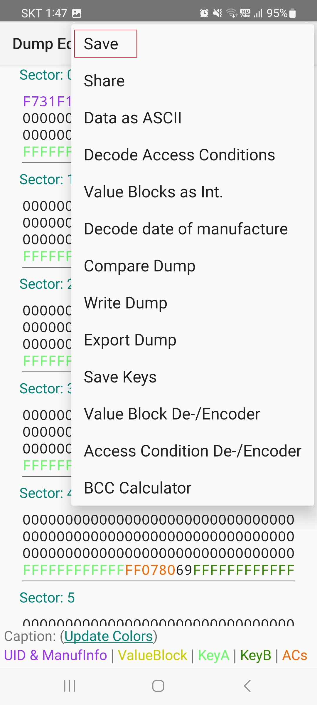 NFC Toolx-NFC Tag Reader 어플을 실행하고 Read Tags를 클릭한 후 핸드폰 뒷면 NFC 위치에 공동현관 카드키를 접촉하면 자동으로 읽는다.