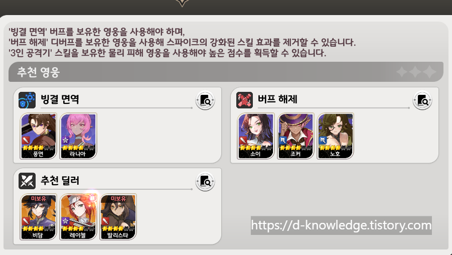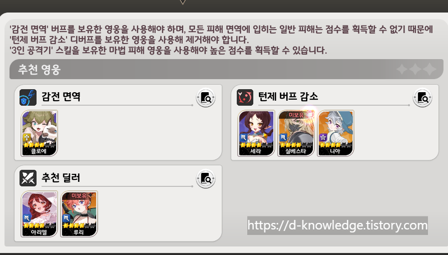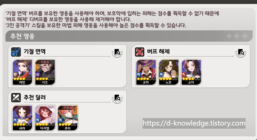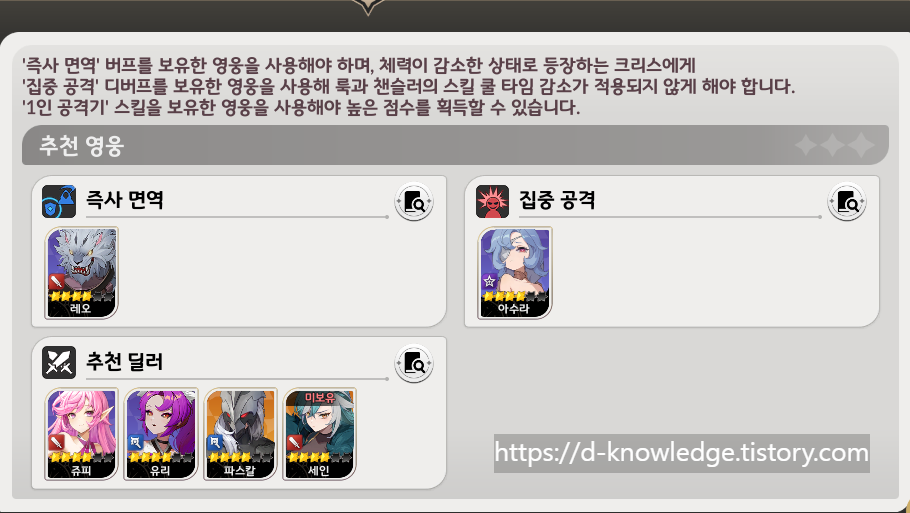 - 최종 추천 : 파스칼, 에스파다, 바네사(2초월 없으면 노호 또는 소이), 아수라, 레오