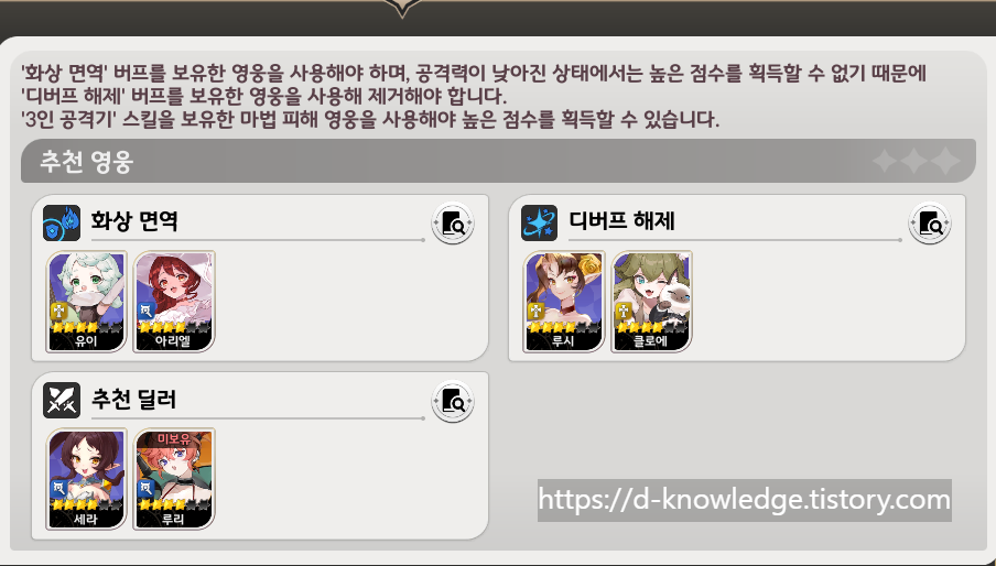 - 최종 추천 : 루리(없으면 파스칼) , 연희, 바네사(2초월 없으면 노호 또는 소이) , 리나, 에반