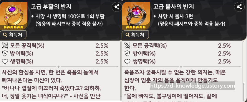 | 고급 부활의 반지 | 사망 시 체력 100%로 1회 부활 (영웅 패시브와 중복 불가) | 모든 공격력 +2.5% 방어력 +2.5% 생명력 +2.5% |