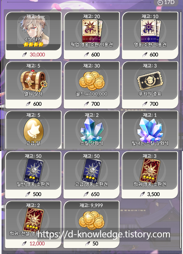 | 픽업 영웅 소환권 | 20개 | 600 |