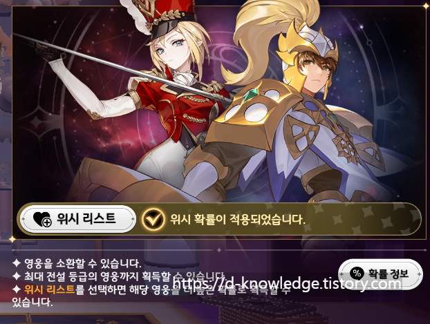 메인 화면 → 소환 → 우측 ‘위시리스트’ 메뉴 클릭 → 영웅 선택 → 저장