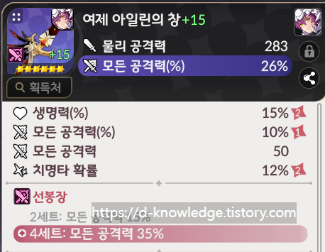 | 무기 | 고정공격 | 치확 | 치피 | 모공퍼 | 방퍼 | 생퍼 | 약공 | 효적 | 모공 | 방어 | 생명 |