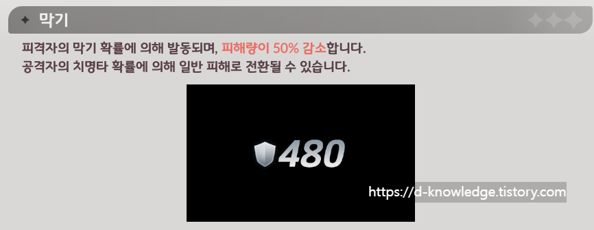 막기 확률이 발동되면 최종 데미지가 50% 감소합니다.