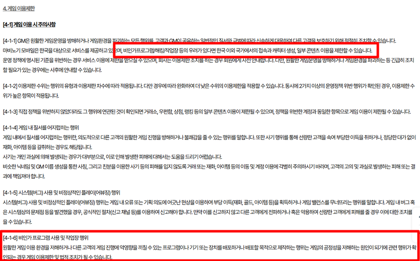 “비공식 프로그램을 사용하거나 조작하는 행위”는 제재 대상이 될 수 있다고 명시되어 있습니다.