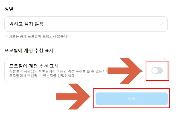 프로필에 계정 추천 표시를 끄고, 아래에 제출 버튼을 클릭해 준다.