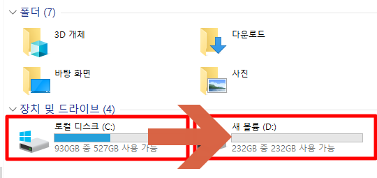 용량이 큰 온라인 게임, 패키지 게임 등은 D드라이브에 설치하는 것이 효율적입니다.