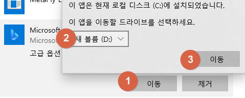 - [이동] 버튼이 있다면, 클릭한 뒤 D드라이브를 선택하여 이동을 완료합니다.