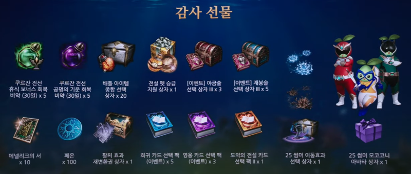 - 보상: 캐릭터 성장 아이템, 카드팩, 회복 물약 등 다양