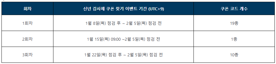 * 본 이벤트를 통해 공개되는 1~3회차 쿠폰은 2월 5일(목) 점검 전 (UTC+9)까지 입력 및 사용하실 수 있습니다.