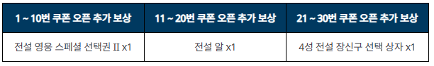 | 번호 | 쿠폰 코드 | 보상 |