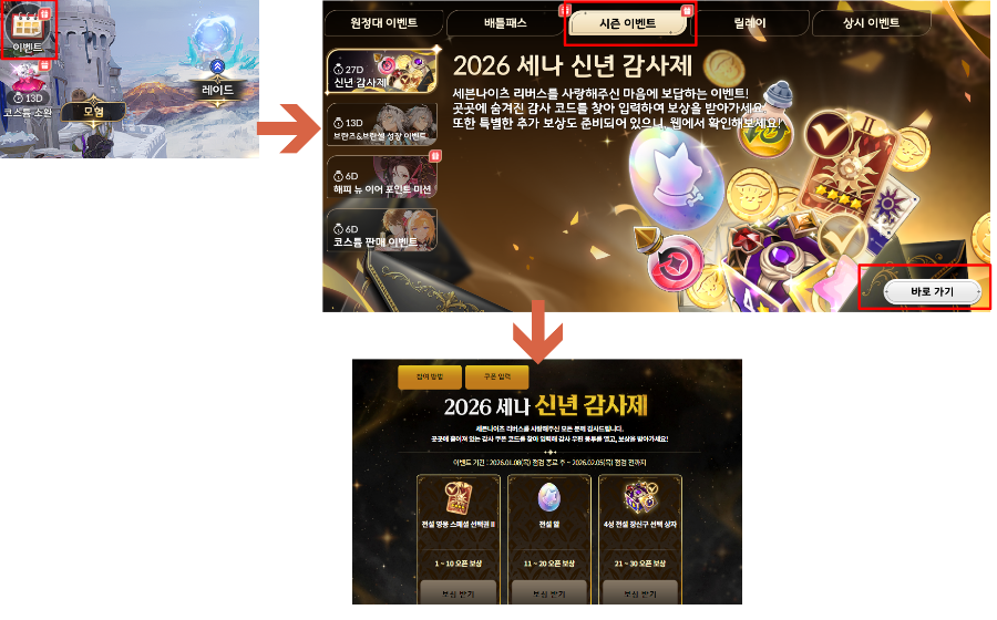 ② 입력한 쿠폰은 인게임 [이벤트] → [시즌 이벤트] → [신년 감사제] 를 통해 확인 가능합니다.