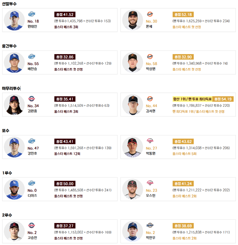 | 포수 | 강민호 (삼성) | 박동원 (LG) |