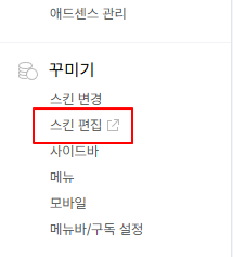 좌측 아래쪽에 꾸미기 탭에 스킨 편집을 클릭하면, 스킨 편집 화면으로 진입하게 된다.