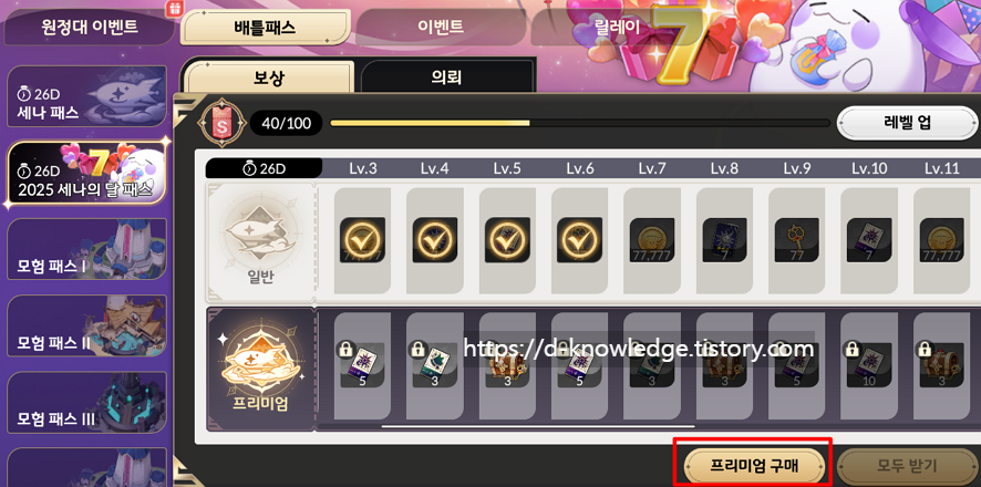 세나의 달 패스에서 프리미엄은 반드시 구매하는 것을 추천드립니다.