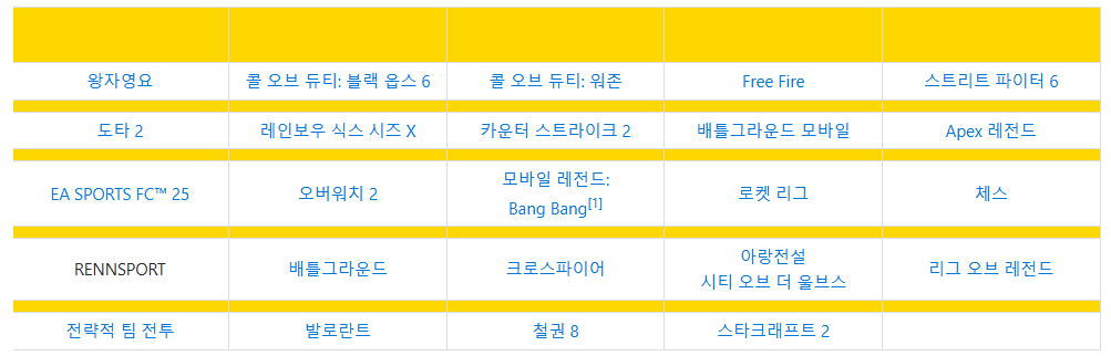 리그 오브 레전드뿐만 아니라 왕자영요, 배틀그라운드 모바일, 오버워치2, 발로란트, 철권8, 스타크래프트2 등 많은 e스포츠 종목들이 참여하고 있습니다.