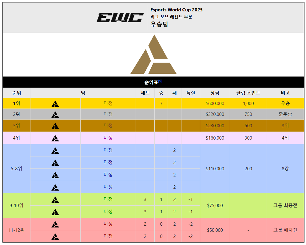 EWC 2025의 리그 오브 레전드 상금은 200만 달러로, 작년보다 2배 증가했습니다.