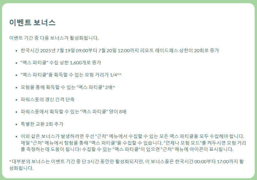 - 모험 거리 1/4, 모험 MP 2배 (0시~17시)