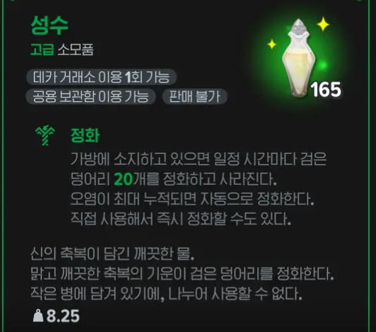 성수는 '신의 축복이 담긴 물'로, 게임 내에서는 오염 정화 전용 아이템입니다.