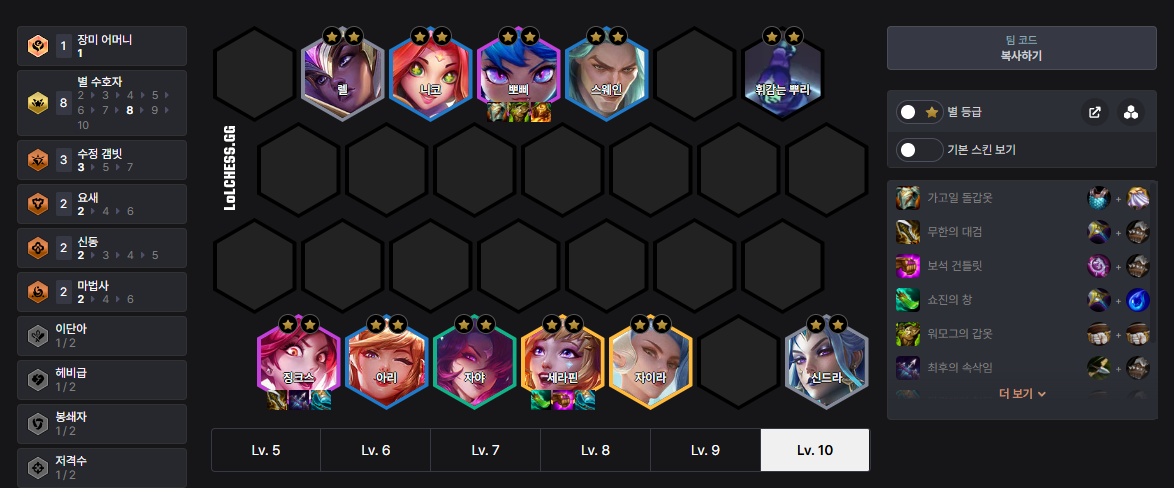 이 조합은 모두 별 수호자 시너지를 받고 있으며, 마나 수급이 빠르고 광역 피해가 뛰어납니다.