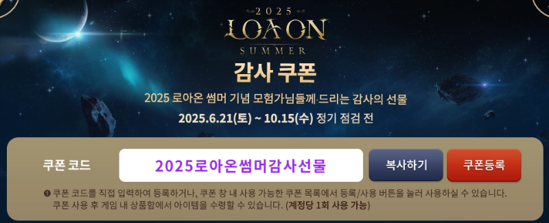 - 쿠폰 사용 후 상품함에서 수령하지 않으면 아이템이 사라질 수 있으니, 즉시 수령을 권장합니다.