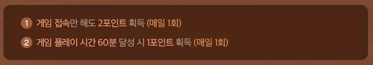 - 게임 플레이 60분 달성 시 1포인트 획득 (매일 1회)