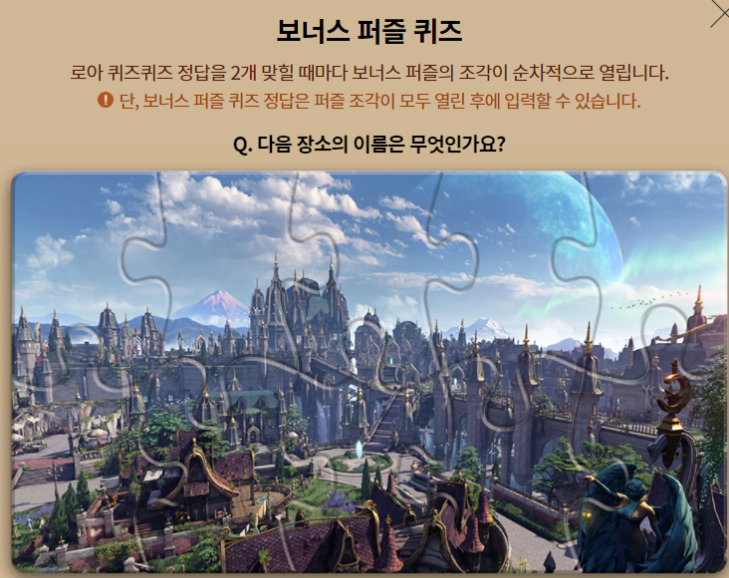 로아 퀴즈퀴즈 정답을 2개 맞힐때마다 보너스 퍼즐의 조각이 순차적으로 열립니다.