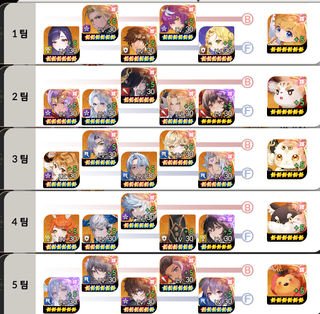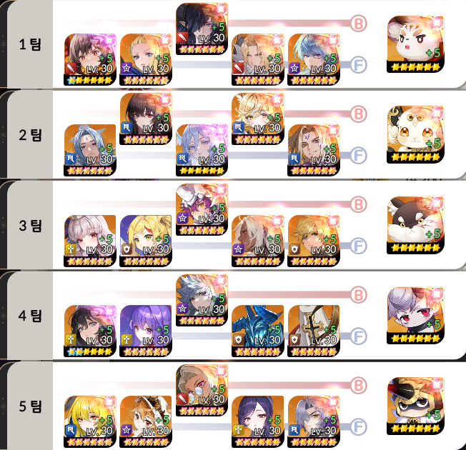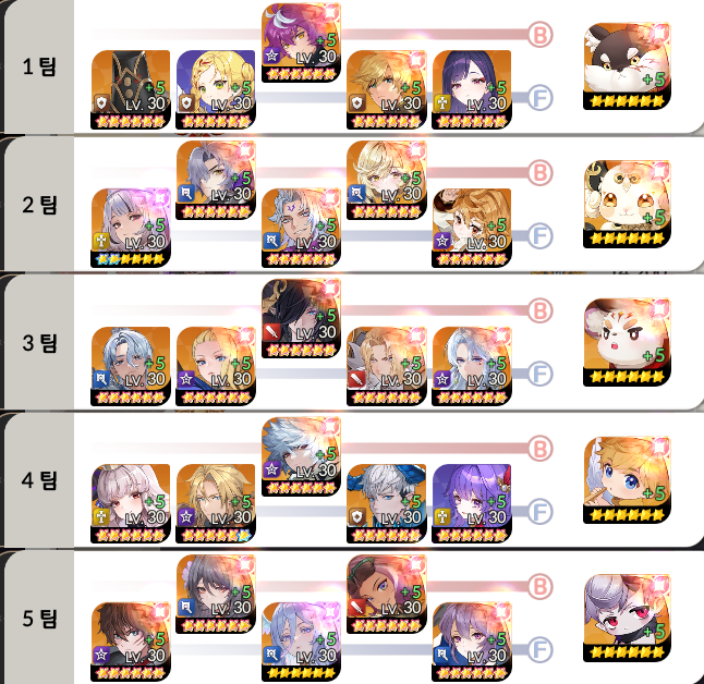 위 덱 예시 중에서 보유한 캐릭터를 중심으로 변형 조합을 만들어 사용하면 총력전에서 충분히 상위 랭크를 노릴 수 있습니다.