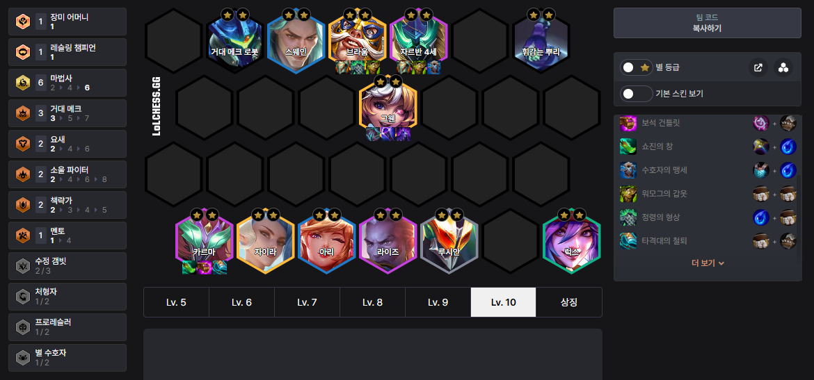 6마법사 시너지를 활용해 카르마와 그웬의 폭딜로 적을 제압하며, 자르반 4세를 중심으로 한 탱커진으로 안정적인 전투를 진행하는 덱입니다.