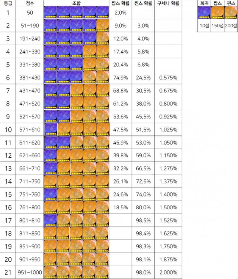 | 등급 | 점수 | 조합 | 짭스 확률 | 찐스 확률 | 구세나 확률 | ||