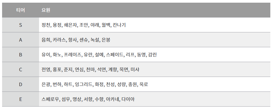 | 정천 | 보조형 딜러 | 추후 픽업에서 경쟁력 낮음 |
