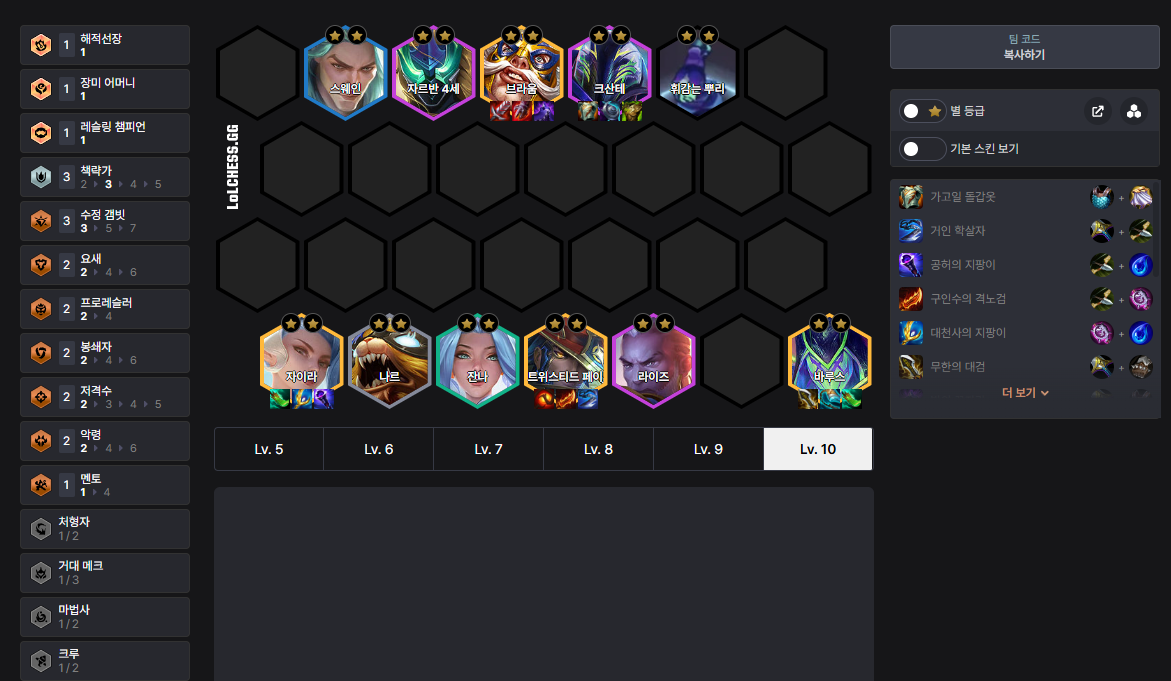 이 덱은 아이템 의존도가 높고, 레벨 타이밍과 골드 관리가 중요합니다