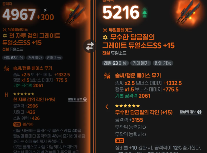 예시로 무기 15강 기준 수치를 비교해보겠습니다.