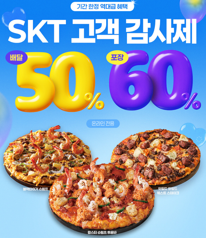 바로 SKT T 멤버십 고객이라면 누구나 도미노피자를 최대 60% 할인 받을 수 있는 특별 이벤트인데요.