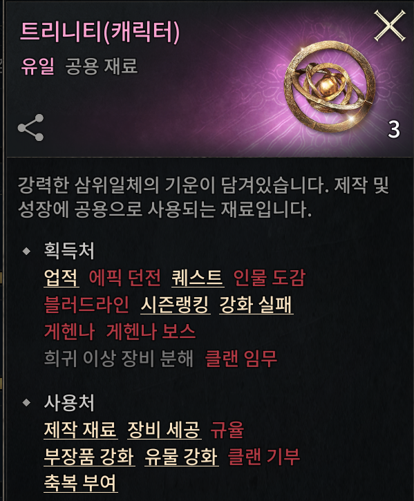 - 📌 획득처 : 메인/서브/일일 퀘스트, 업적, 월드 보스, 장비 분해