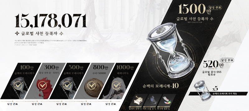 또한, 글로벌 SNS 팔로워 520만 달성 시 추가 보상으로 순백의 모래시계 ×5가 제공됩니다.