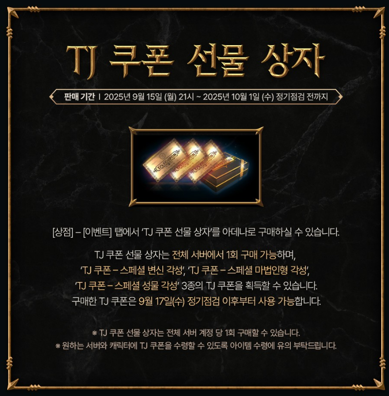 특히 사전예약 쿠폰 3종과 TJ 쿠폰 선물 상자는 초보 유저와 고레벨 유저 모두에게 큰 도움이 되므로 반드시 챙기시길 바랍니다.