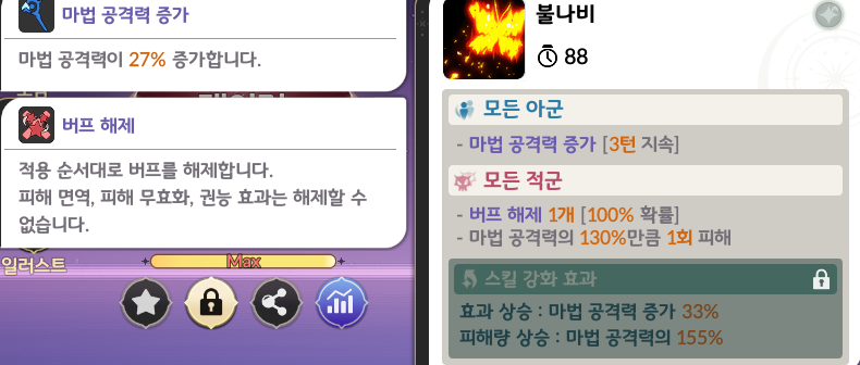 특히, 불나비 스킬의 버프 해제 + 전체 마법 공격력 증가는 범용성이 높은 효과다.