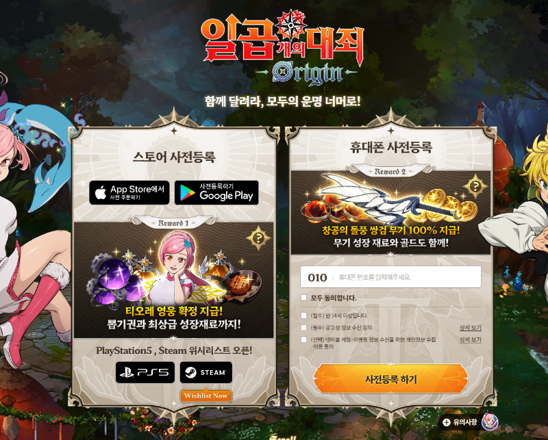 일곱 개의 대죄 오리진은 공식 사이트와 주요 앱 마켓에서 간편하게 사전 등록할 수 있습니다.