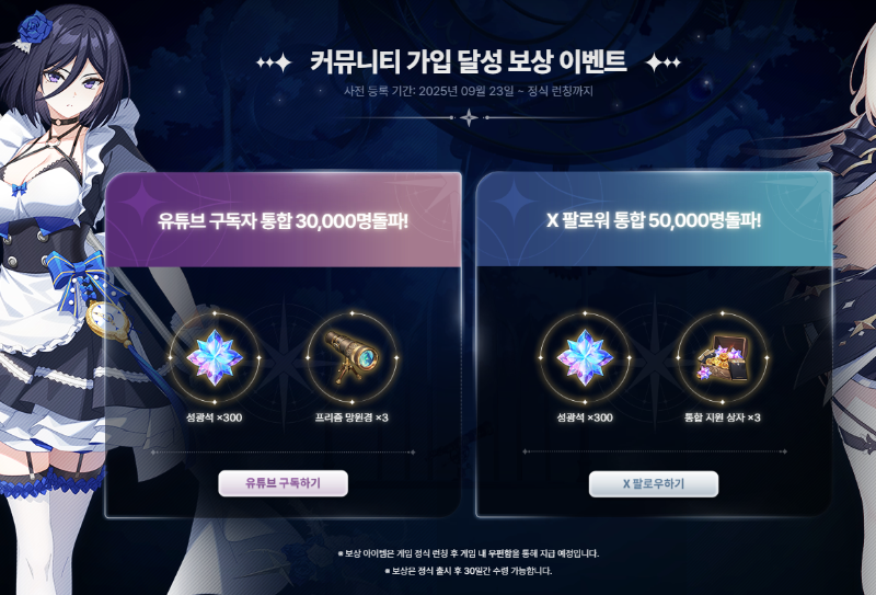- 커뮤니티 참여: 이벤트 참여 보상은 사전예약 인원 달성 보상과 별개로 지급되므로, SNS와 공식 커뮤니티 가입을 추천합니다.