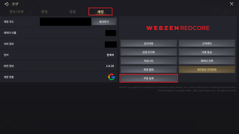 - 게임 실행 후 [메뉴 > 옵션 > 계정 > 쿠폰 등록] 이동