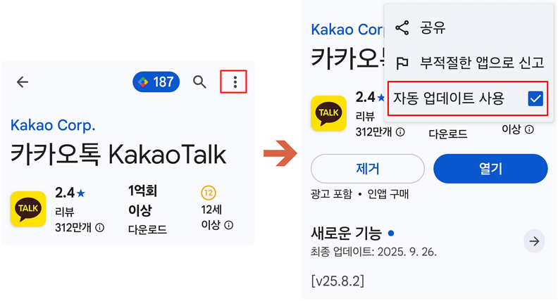 3️⃣ 오른쪽 상단 메뉴에서 ‘자동 업데이트’ 비활성화
