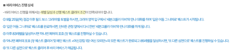👉 이 단계까지 완료하면, 본격적으로 바리 어비스 입장을 위한 선행 퀘스트 준비가 마무리됩니다.