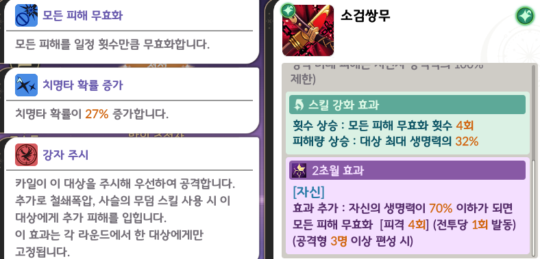 - 다중 타격 + 버프 해제 + 강자 주시 + 피해 무효화