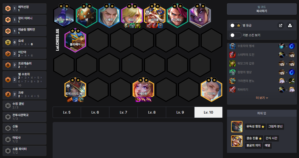 이 덱의 핵심은 트위스티드 페이트(딜러)와 레오나·브라움(탱커)의 안정적인 전면 조합, 그리고 세라핀의 서포트 능력입니다.