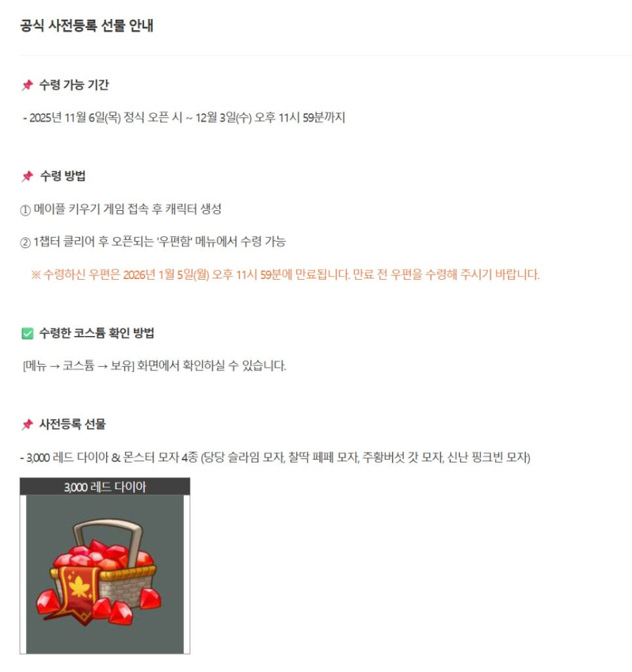 | NO1MAPLEIDLE | 동료 소환권 100개 미라클 큐브 10개 명예의 훈장 5,000개 |