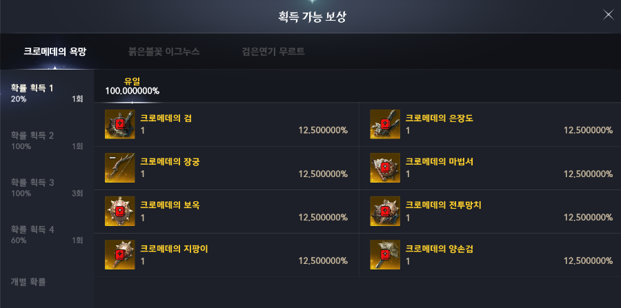 - 8개 직업 중 랜덤 → 내 직업 무기이면 획득 성공